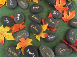 Last fall I offered a meditative session to our youth gathering called “Give and Take.” The object was to engage our senses through tactile learning. We collectively wrote our Thanksgivings on a pumpkin that sat on the center of a table. Then we picked up a rock that was inscribed with something we wished to take with us, whether it was something we needed to hold and pray for ourselves, or to pass on to another. The tactile engagement with our thoughts and prayers made them real and relavent. They became tangible and alive. Last night I met a friend who attended that gathering and she said, ” I still carry that rock with me, you know.” I didn’t know, and my heart smiled.